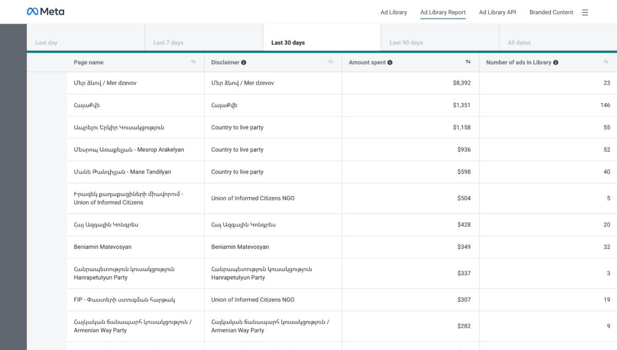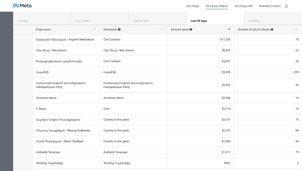 Եթե դիտարկենք վերջին 90 օրը, ապա կտեսնենք, որ հիմնական գովազդ տեղադրողը եղել է Քաղաքացիական պայմանագիրը: Ընդ որում, Արմավիրի մարզի Վաղարշապատ համայնքի ղեկավար Արգիշտի Մեխակյանը հիմնական չեմպիոնն է ընդհանուր 11220 ԱՄՆ դոլար կազմող իր 75 գովազդներով (այս պահին նա այլևս գովազդներ չի տեղադրում, և ընտրություններին նախորդած ժամանակահատվածում էլ չի տեղադրել)։ Մեր ձևով շարժումը գովազդի վրա երեք ամսում ծախսել է 8392,23 ԱՄՆ դոլար։ Միայն վերջին 7 օրվա մեջ շարժումը գովազդների վրա ծախսել է 3339 ԱՄՆ դոլար։ Ապրելու երկիր կուսակցությունն իր տարբեր ներկայացուցիչների էջերով երեք ամսում ծախսել է մոտ 6000 ԱՄՆ դոլար։ Ընդ որում հետաքրքիրն այն է, որ ողջ ընթացքում՝ 2022-ից մինչ այսօր, կուսակցությունը ծախսել է ընդհանուր 10207 դոլար, իսկ միայն Թանդիլյան Մանեն իր էջով՝ 10,168 դոլար։