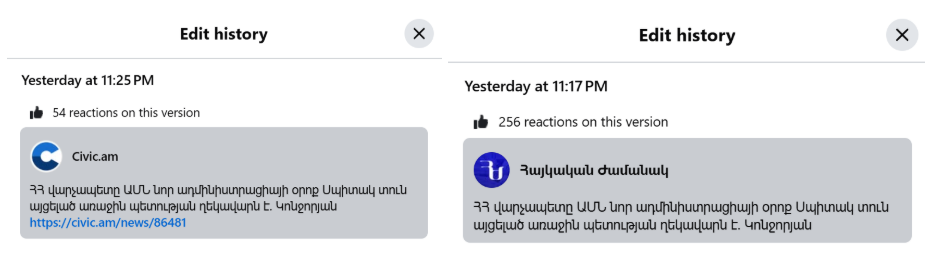 Առաջին երկու լրատվամիջոցներն արդեն խմբագրել են գրառումը, սակայն նախնական տարբերակը հնարավոր է տեսնել փոփոխությունների պատմության մեջ։