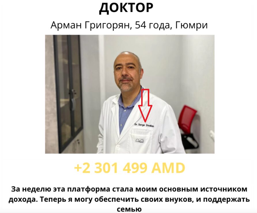 Բժիշկը, որի անունը գրված է Արմեն Գրիգորյան, իրականում Սերժ Դուլյանն է և դա նշված է նաև նրա հագուստի վրա։ Կեղծարարները լուսանկարը վերցրել են Repat Armenia-ի ֆեյսբուքյան էջից։