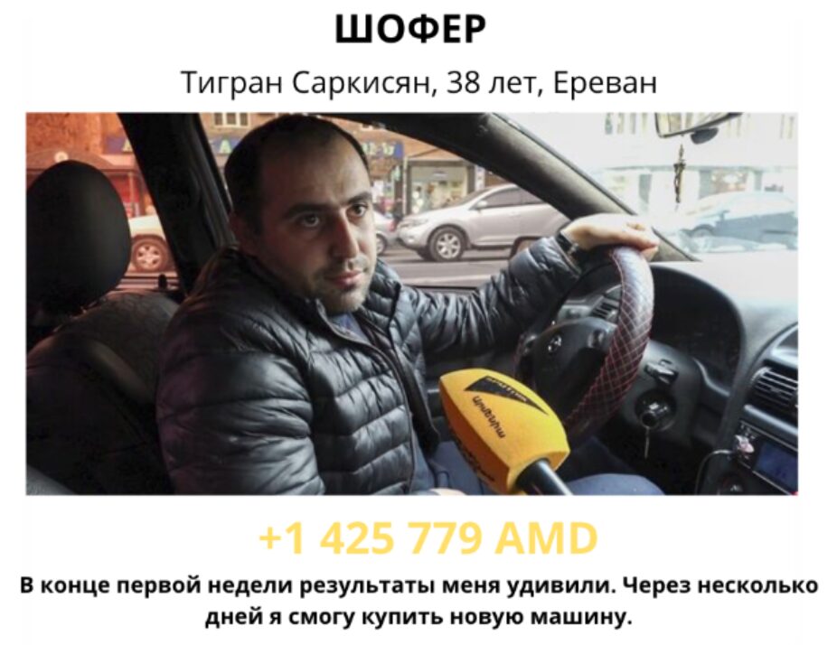 Իբրև ապացույց նյութում կցվել են վարորդի և բժշկի նկարներ և նշել, թե վերջիններս արդյունքներից շատ գոհ են։ Վարորդն իբրև նշել է, թե գործարքն այնքան արդյունավետ է, որ մի քանի օրից մեքենա է գնել, իսկ բժիշկը իբրև ասել է, թե այդ ներդրումը դարձել է իր համար եկամտի հիմնական աղբյուր։
