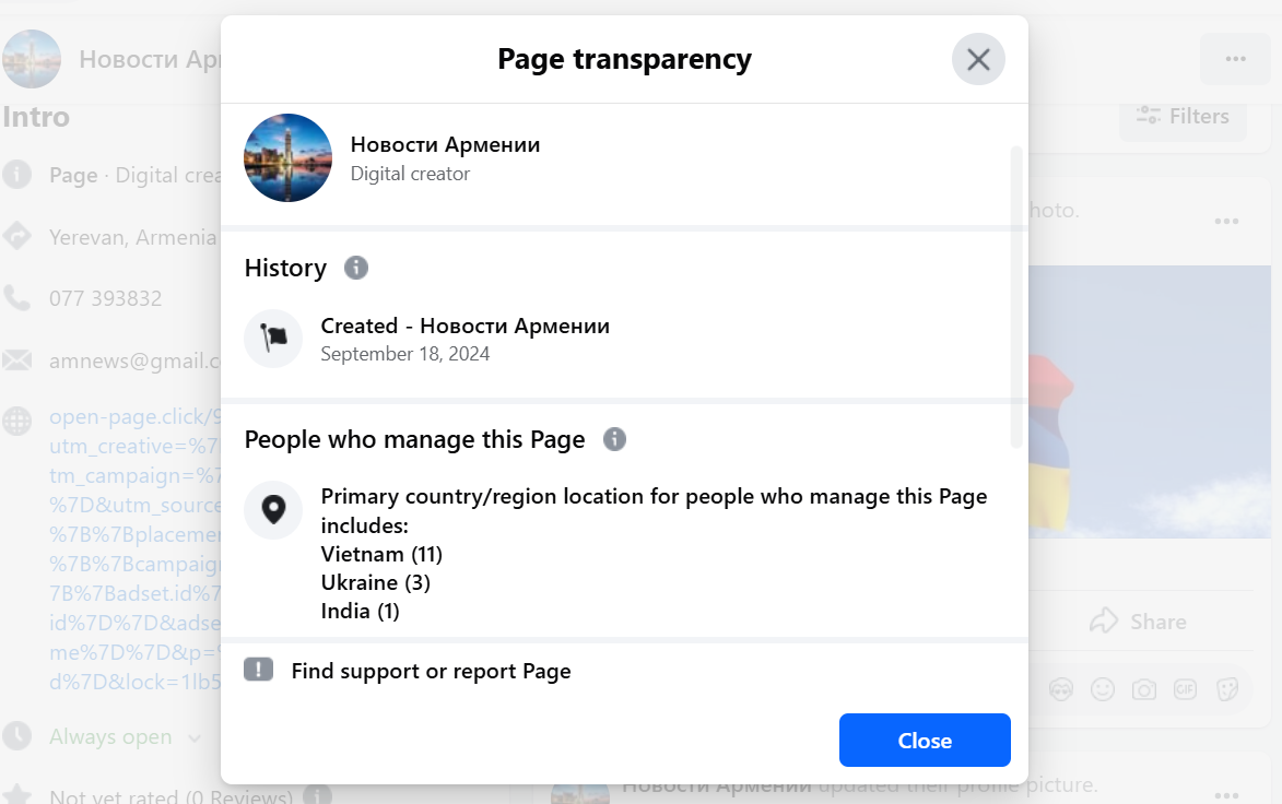 Новости Армении Ֆեյսբուքյան էջը ստեղծվել է 2024-ի սեպտեմբերին, նշվում է, որ էջը կառավարվում է 15 հոգու կողմից, որոնցից 11-ը Վիետնամից, 3-ը Ուկրաինայից, մեկը՝ Հնդկաստանից, սակայն այս տվյալները չենք կարող որպես հիմք ընդունել, որովհետև դրանք կարելի է կեղծել օրինակ՝ VPN համակարգով։