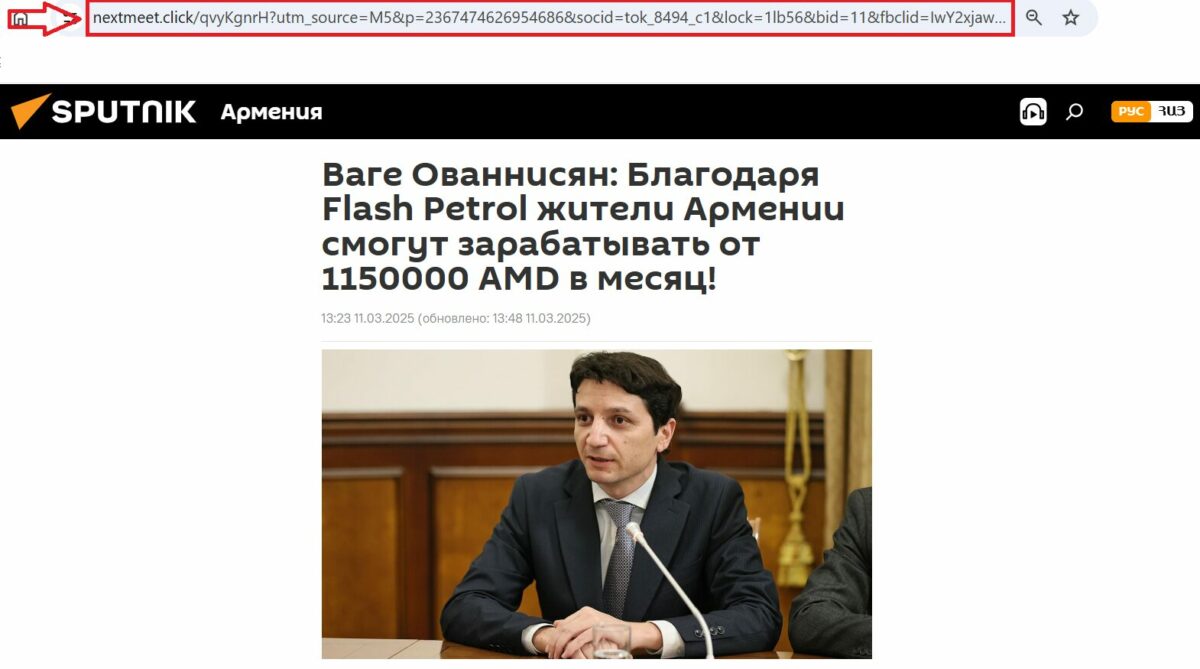 Новости Армении ֆեյսբուքյան էջը գովազդով տարածում է (արխ․) տեղեկություն, թե իբր Հայաստանի ֆինանսների նախարարությունը նոր օրինագիծ է ընդունել, որը կօգնի Հայաստանի քաղաքացիներին գումար վաստակել՝ կատարելով փոքր ներդրումներ Flash Petrol Invest հարթակում։