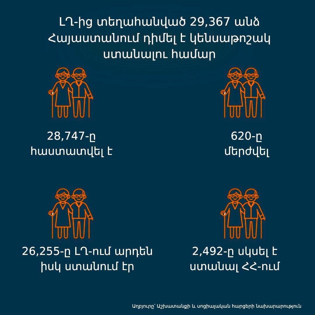 Աշխատանքի և սոցիալական հարցերի նախարարության տրամադրած տվյալների համաձայն՝ 2023 թ․ դեկտեմբերի 10-ից մինչև 2025 թ․ մայիսի 26-ը Հայաստանում կենսաթոշակ ստանալու համար դիմել է բռնի տեղահանված 29,367 անձ։