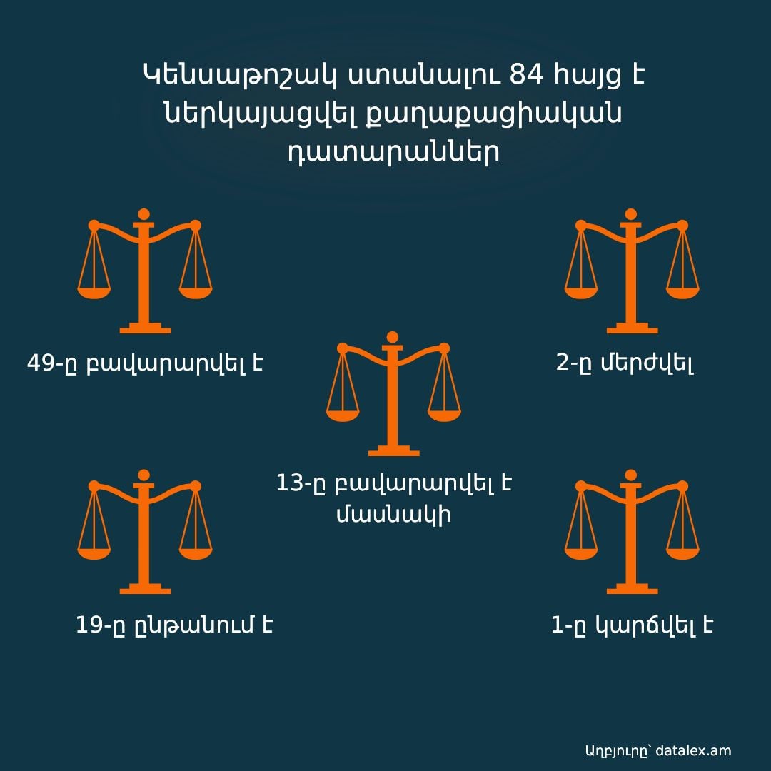 Քաղաքացիական դատարաններում ներկայացված 84 հայցերի հիմնական մասը վերաբերում է աշխատանքային ստաժի հաստատմանը։ Ներկայացված հայցերից 49-ը բավարարվել է։