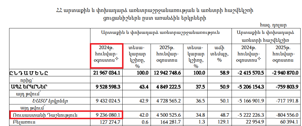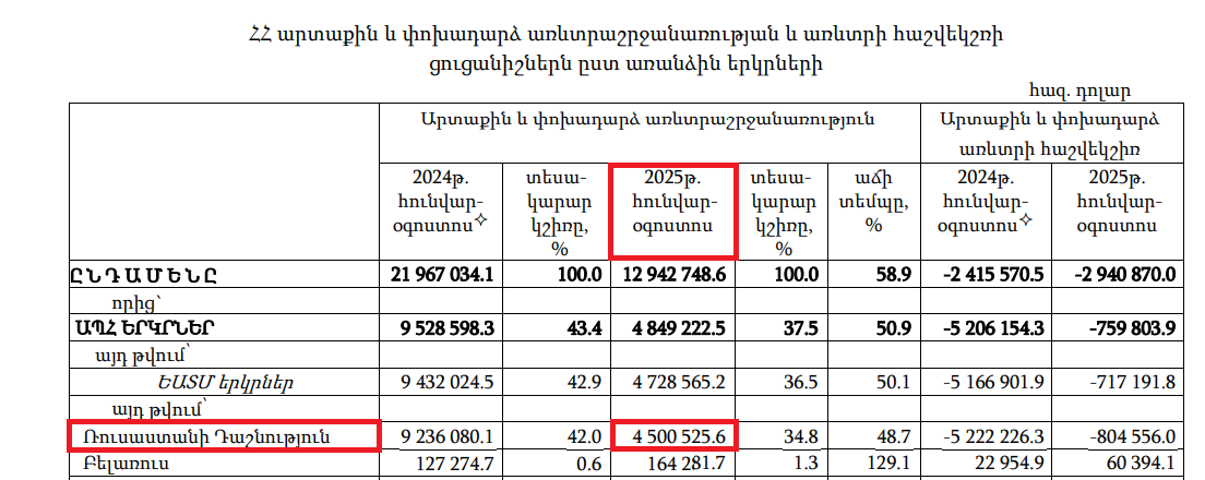 2025-ի հունվարից օգոստոս Ռուսաստանի և Հայաստանի միջև փոխադարձ առևտրաշրջանառությունը կազմել է 4 միլիարդ 500 միլիոն դոլար։