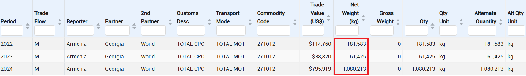 Comtrade Database-ի համաձայն՝ 2020-2024 թվականներին Վրաստանից բենզին է գնել նաև Հայաստանը՝ ընդհանուր 1323 տոննա ծավալով: