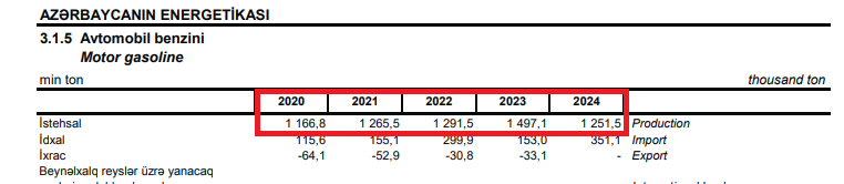 Ադրբեջանի պետական վիճակագրական կոմիտեի հրապարակած «Ադրբեջանի էներգետիկան 2025» տարեգրքում ներկայացված են բենզինի արտադրության և սպառման ծավալները 2020-2024 թվականների համար։ Զեկույցից տեղեկանում ենք, որ Բաքուն պրեմիում բենզինի արտադրությունը սկսել է 2024 թվականին, սակայն АИ-92 (ռեգուլյար), АИ-95 (պրեմիում) և АИ-98 (սուպեր) բենզինների ծավալները գումարված են իրար և ներկայացված են որպես մեկ թիվ։
