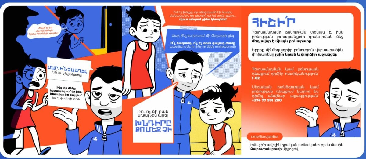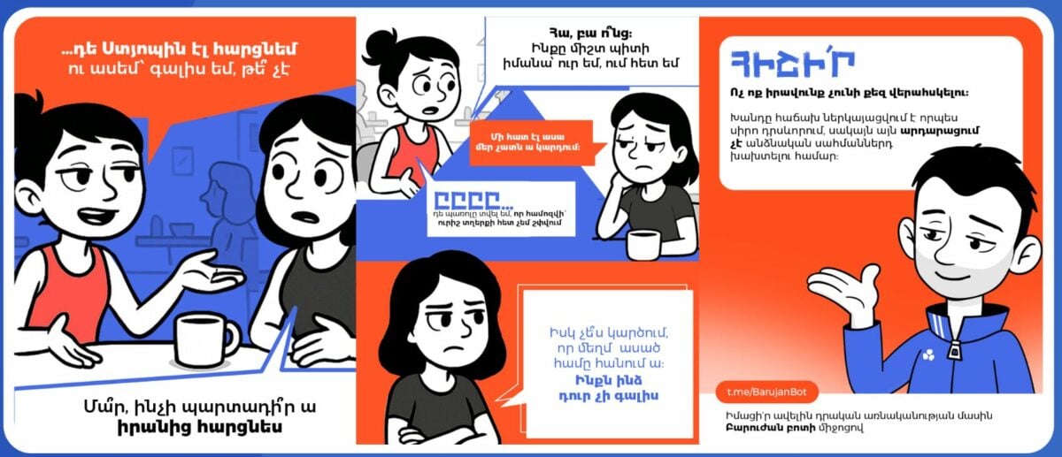 Հենվելով  մեր փորձագետների հոդվածների և վստահելի աղբյուրների վրա՝ նա անհատականացված կերպով պատասխանում է գենդերի և առնականության վերաբերյալ օգտատերերի տարբեր հարցումների։ Մենք նաև սոցիալական մեդիա արշավ ենք իրականացրել, որի ընթացքում 3 ինֆլուենսերներ ռիլեր են պատրաստել։ Նրանց օգնությամբ ներկայացրել ենք տնային չվճարվող աշխատանքի, սեռական բռնության և ագրեսիայի կառավարման թեմաները։ 4 կոմիքսներ ենք պատրաստել, որոնք անդրադառնում են այն կարծրատիպերին, որոնք հաճախ մարդիկ չեն էլ նկատում կամ առաջին հայացքից խնդրահարույց չեն համարում՝ օրինակ Ինստագրամի գաղտնաբառը կիսելը, որը բնականաբար հաճախ վերաբերում է աղջիկներին։ Տղաները պատճառաբանում են իբր խանդում են կամ որ դա սիրո նշան է և այլն։ Բայց սա բացահայտ վերահսկողություն է, իշխանության ձգտում է, որն արդեն իսկ բավականին մտահոգիչ է։